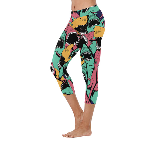 Angry Shark Seamless Pattern Sea Life Women's Low Rise Capri Leggings (Invisible Stitch)