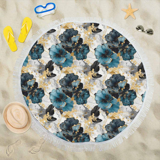 Blue & Gold Ink Floral Circular Beach Towel Shawl 59"
