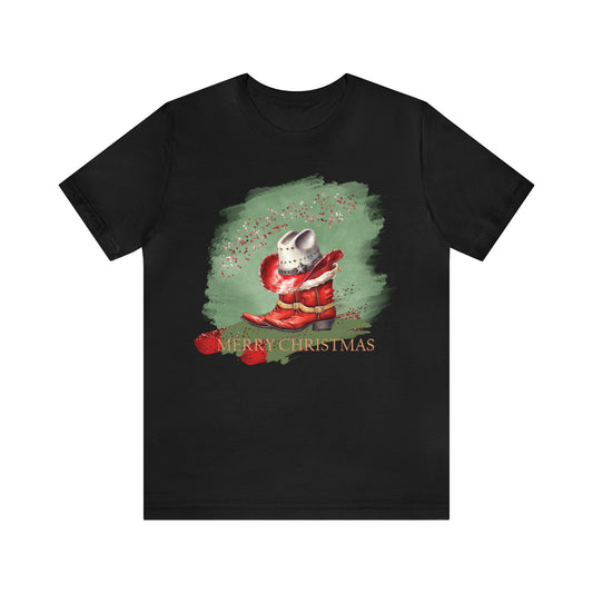 Unisex Jersey Short Sleeve Tee, Sage Christmas, Western Christmas, Country Christmas, Country Boots and Hat, Christmas TShirt