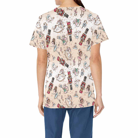 Christmas Nutcracker Sml Print Women's V Neck Scrub Top Nurse Uniform with Deep Front Pockets