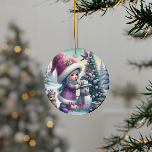 Cute Christmas Ceramic Ornament, Girl with Snowman Scene, Personalized Christmas Decor, Holiday Tree Ornament, Custom Gift