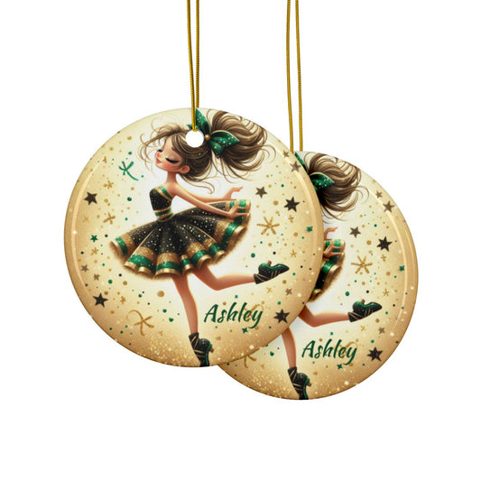 Cheerleader Ornament, Personalized Holiday Decor, Cheerleader Gift, Ceramic Christmas Ornament, Custom Cheer Decor, Gold and Green