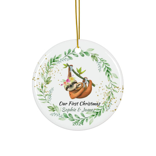 Personalized Sloth Ornament, Christmas Ceramic Decoration, Custom Holiday Gift, Cute Animal Keepsake, Couple Ornament, First Christmas